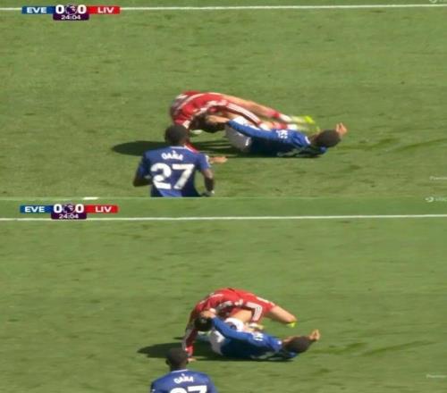 在埃弗頓與利物浦的默西賽德郡德比中,「太妃糖」前鋒伊利曼·恩迪亞耶倒地時,似乎也有拉扯利物浦中場索博斯洛伊頭發(fā)的行為,當(dāng)值裁判同樣沒有加以處罰。