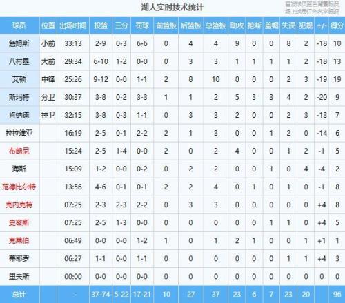 艾頓19分10板、八村塁13分3板1助、詹姆斯10分4板9助、斯瑪特9分2板5助3斷3帽、范德比爾特8分4板、克內(nèi)克特8分3板、肯納德7分3板2助、拉拉維亞6分3板