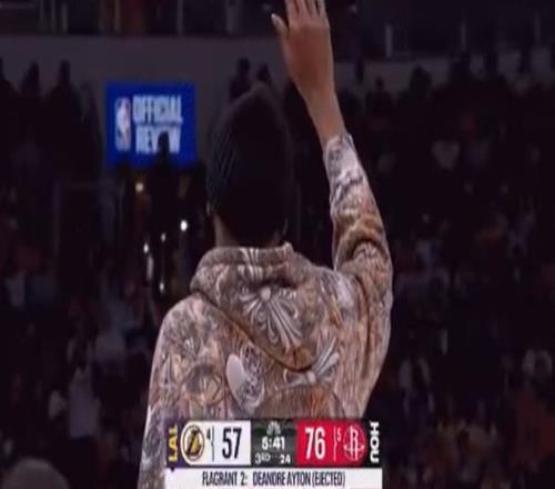 到了比賽最后一分鐘,火箭的阿龍·霍勒迪和湖人的蒂耶羅爆發(fā)了沖突,打起來了,于是兩人都被吹了技術犯規(guī),被驅逐出場。