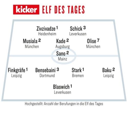 體育播報4月27日宣 德國媒體《踢球者》評出了德甲第31輪最佳陣容,奧利塞、穆西亞拉、希克在列。