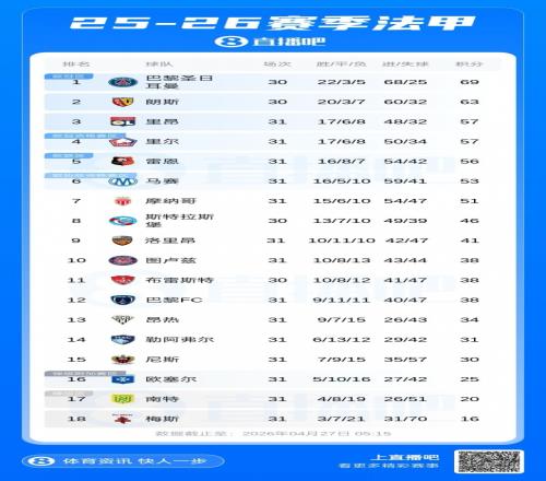 法甲方面,巴黎領先朗斯6分,兩隊均還剩4場未踢,倒數(shù)第二輪直接對接。
