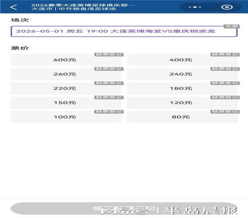 5月1日19時(shí),中超第九輪,大連英博將主場(chǎng)迎戰(zhàn)重慶銅梁龍。4月27日11時(shí)58分鐘,球票開(kāi)始發(fā)售,只用了5分鐘便全部售罄,創(chuàng)造了本賽季售罄速度紀(jì)錄。