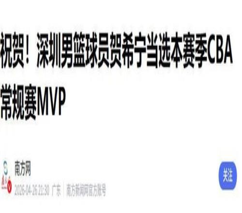信息來(lái)源:祝賀!深圳男籃球員賀希寧當(dāng)選本賽季CBA常規(guī)賽MVP——南方網(wǎng) 2026-04-26