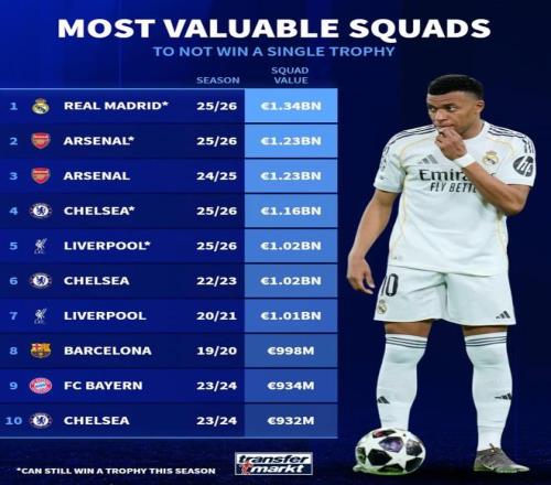 1. 皇家馬德里 25-26賽季(未結(jié)束) 13.4億歐元