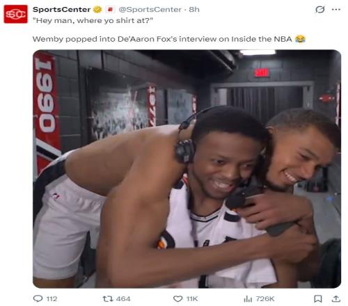 拿到福克斯28分7助攻6籃板4個(gè)三分1搶斷2蓋帽在賽后接受采訪,結(jié)果文班亞馬赤膊來影響??怂共稍L,文班亞馬與福克斯的關(guān)系非常之好,福克斯完全沒有抗拒,他就這樣讓文班亞馬抱著繼續(xù)接受訪問。