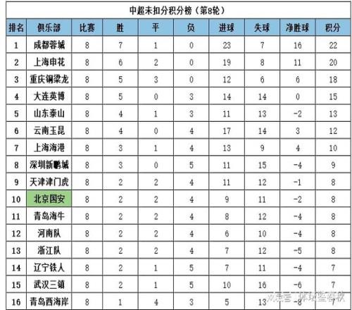 最后再來看看北京國安的情況,聯(lián)賽8輪過后,國安只取得了2場勝利,上一輪主場2-4慘敗天津津門虎,3個主場未嘗一勝。雖然排名第十位,但距離倒數(shù)第一的青島西海岸只有1分差距。如果再輸,就會跌進降級區(qū)。而這已經(jīng)是國安隊史同期的最差開局成績了,而且現(xiàn)在還看不到球隊明顯止跌的信號,主教練蒙哥馬利的帥位也已經(jīng)岌岌可危。