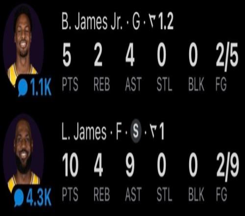 此役,詹姆斯出戰(zhàn)33分13秒,9投2中,三分3中0,罰球6中6,僅得10分4板9;布朗尼替補(bǔ)出戰(zhàn)15分半,投籃5中2,三分球4中1,拿到5分2籃板4助攻。