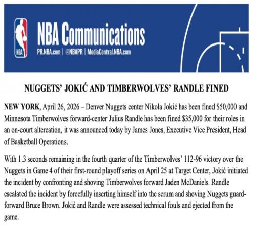 體育播報(bào)04月27日宣 NBA官方宣布,約基奇因參與場(chǎng)上沖突被罰50000美元,蘭德爾因同樣的原因被罰35000美元。