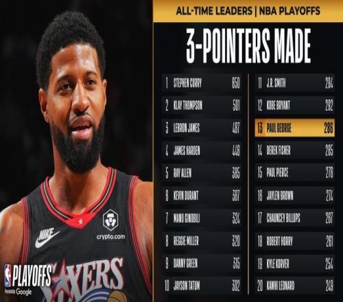 NBA官方發(fā)布統(tǒng)計,喬治季后賽三分數(shù)來到286記,超越費舍爾升至歷史第13,距離12的科比只差6個。