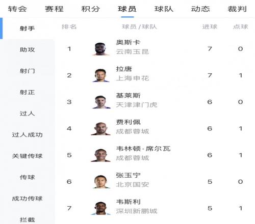中超射手榜:奧斯卡雙響以7球與拉唐并列榜首,基萊斯等3人6球