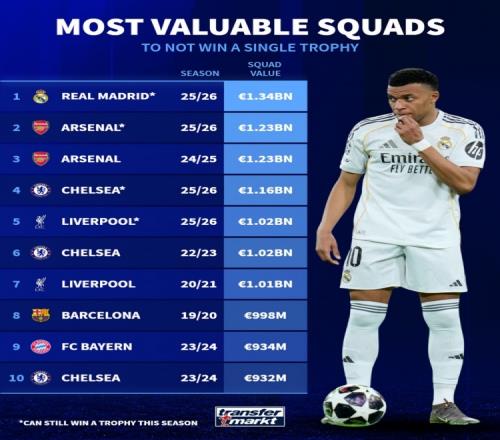 德轉(zhuǎn)列無冠球隊(duì)身價(jià)榜:若皇馬、阿森納本賽季無冠,將排名前兩位
