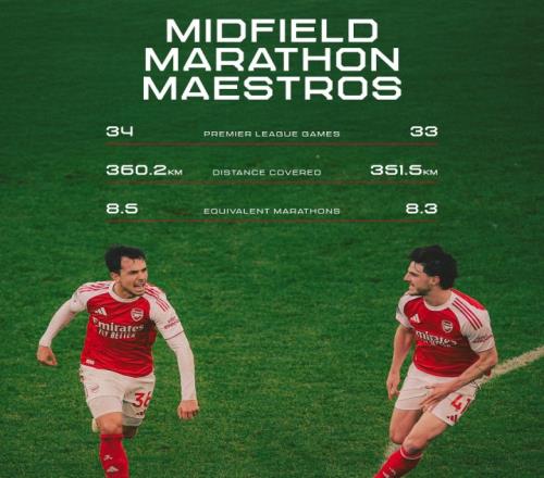 體育播報(bào)04月27日宣 阿森納官方曬出一組數(shù)據(jù)圖,阿森納中場(chǎng)二人組蘇維門迪和賴斯本賽季英超跑動(dòng)距離相當(dāng)于跑八次全馬。