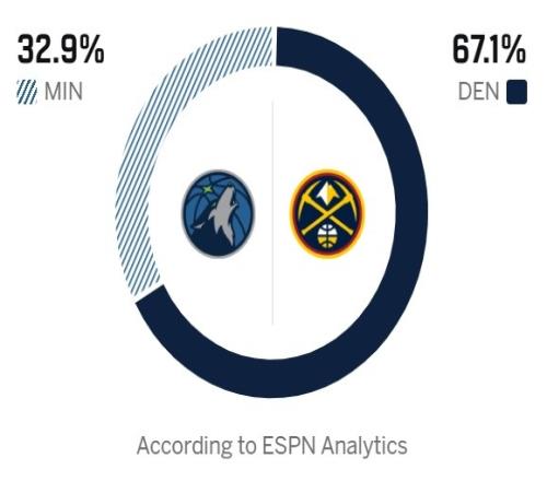 今天,ESPN預測本場勝率,森林狼32.9%,掘金67.1%。