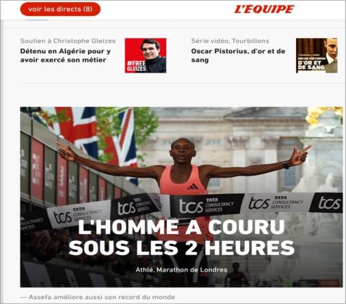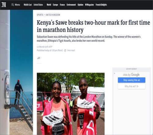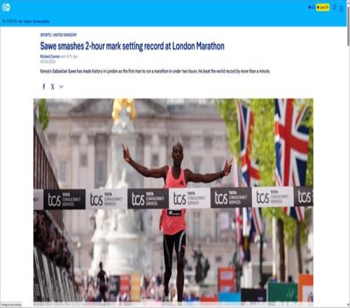 法國《世界報(bào)》以法新社稿件形式報(bào)道薩維“破2”,重點(diǎn)強(qiáng)調(diào)這是馬拉松史上首次在正式比賽中突破2小時(shí)。報(bào)道既對(duì)比了基普喬格2019年非正式“破2”與薩維此次世界紀(jì)錄的區(qū)別,也提到薩維穿著重量低于100克的阿迪達(dá)斯Pro Evo 3超級(jí)跑鞋參賽。女子組方面,《世界報(bào)》同樣關(guān)注阿塞法以2小時(shí)15分41秒衛(wèi)冕并刷新純女子組世界紀(jì)錄,使本屆倫敦馬拉松成為極具歷史性的賽事。