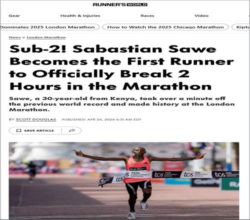 專業(yè)跑步媒體《跑者世界》的報(bào)道不只是記錄薩維“破2”,而是從多個(gè)維度解釋這場(chǎng)比賽為何具有時(shí)代意義。文章以“It happened!”開篇,強(qiáng)調(diào)薩維在倫敦跑出1小時(shí)59分30秒,成為首位在符合紀(jì)錄認(rèn)證條件的馬拉松賽道上突破2小時(shí)的運(yùn)動(dòng)員,并將基普?qǐng)D姆的原世界紀(jì)錄提升1分05秒。報(bào)道同時(shí)指出,這不是孤立的奇跡:凱杰爾查首馬即以1小時(shí)59分41秒獲得亞軍,大幅刷新男子馬拉松首秀紀(jì)錄;基普里莫以2小時(shí)00分28秒獲得第三,也快過舊世界紀(jì)錄。