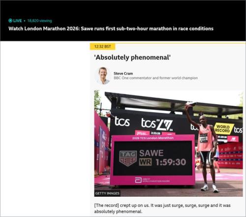BBC 的報(bào)道更突出現(xiàn)場(chǎng)轉(zhuǎn)播中的震撼感與人物情緒。評(píng)論員史蒂夫·克拉姆稱,紀(jì)錄是在薩維一次次加速中“悄然逼近”的,自己從未見過這樣的沖刺;保拉·拉德克利夫則評(píng)價(jià)說,馬拉松運(yùn)動(dòng)的標(biāo)尺已經(jīng)被重新移動(dòng)。BBC 還用配速數(shù)據(jù)呈現(xiàn)薩維后程越跑越快:35公里后平均配速從每公里2分47秒提升到2分45秒,最后階段達(dá)到2分40秒。薩維賽后感謝倫敦觀眾,稱這一天的成就“不只屬于我,也屬于倫敦的所有人”。