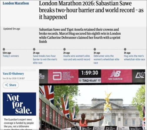 英國《衛(wèi)報(bào)》以全程直播方式記錄2026年倫敦馬拉松,將薩維的“破2”與阿塞法刷新女子純女子組世界紀(jì)錄、胡格第八次倫敦奪冠、德布倫納沖刺取勝并列呈現(xiàn),稱這是倫敦馬拉松又一個(gè)紀(jì)錄之日。記者肖恩·英格爾在 The Mall 現(xiàn)場(chǎng)寫下文字,稱薩維被稱作“沉默的刺客”,但他在倫敦街頭完成的是“美麗的毀滅”——他將基普?qǐng)D姆的原紀(jì)錄提升65秒,“徹底粉碎”了這一紀(jì)錄。薩維賽后表示,這一天“不只屬于我,也屬于倫敦的每一個(gè)人”。