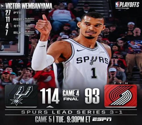 文班復出27分7帽 馬刺3-1開拓者