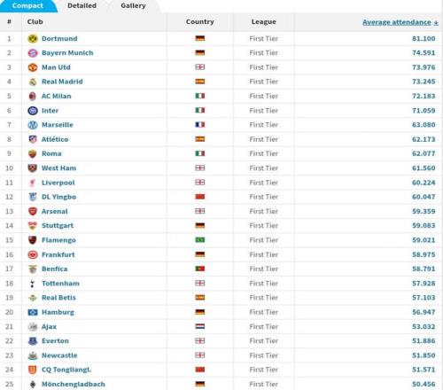全球球隊(duì)主場平均上座人數(shù)TOP25: