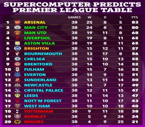 超算預(yù)測英超大結(jié)局:阿森納3分優(yōu)勢奪冠,熱刺落后鐵錘2分降級