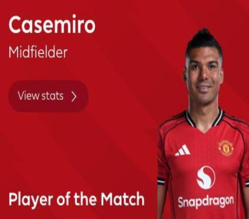 英超第34輪,曼聯(lián)主場2-1擊敗布倫特福德,此役打入一球的卡塞米羅當(dāng)選全場最佳球員。