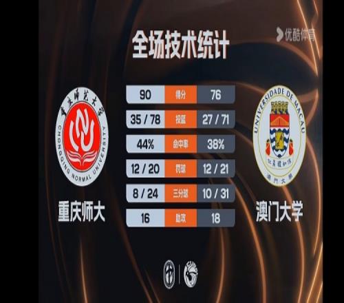 重慶師大:譚博文17分16板,姜仁哲17分7板,翟乾江25分8板,歐陽占強(qiáng)15分9板4助,陳王黎果11分