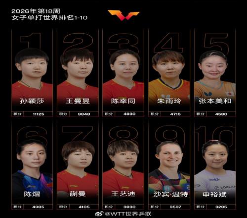 WTT世界排名:王楚欽領跑男單,孫穎莎王曼昱陳幸同包攬女單前三