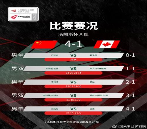 體育播報4月27日宣 湯姆斯杯小組賽第二輪,中國隊vs加拿大隊,在首盤石宇奇因身體不適退賽被判負的情況下,中國隊直落四盤,最終以4-1的大比分擊敗對手,提前晉級八強。