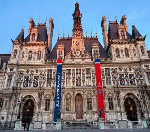 迎來歐冠半決賽,巴黎市政廳掛起巴黎圣日耳曼主色調(diào)的條幅