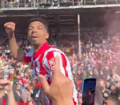 根據(jù)外網(wǎng)流傳的視頻,在確認(rèn)升級(jí)后,林肯城的球員和球迷陷入瘋狂。球員哈克特坐在一名球迷肩上,大家齊聲高唱“Tottenham away, Ole Ole!”,表達(dá)下賽季球隊(duì)就可以在聯(lián)賽中面對熱刺了。