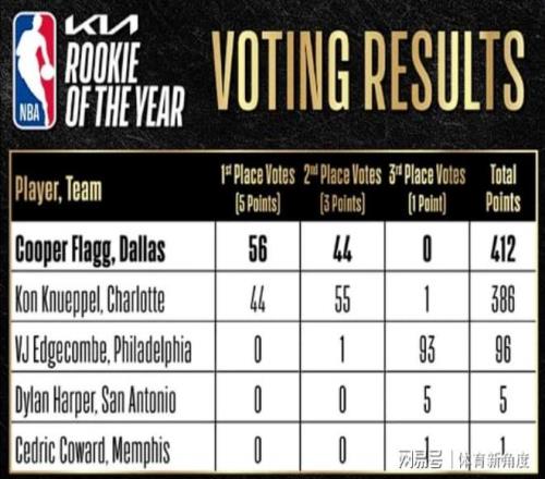 讓我們把目光聚焦到投票環(huán)節(jié),弗拉格憑借412分的絕對優(yōu)勢高居榜首,克尼普爾則以386分位列第二。實際上,克尼普爾的表現也相當出色,與弗拉格僅有26分的分差,這26分的差距是近20年來ROY(最佳新秀)票選中第二小的分差。不過,在賽季末段,克尼普爾的表現稍顯平淡,未能為自己爭取到更多的支持票數。