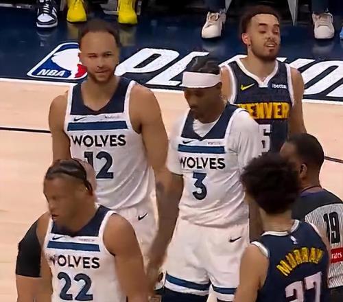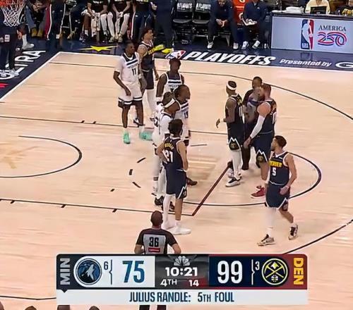 末節(jié)開場森林狼又一個失誤,李凱爾手肘開路吃進攻犯規(guī),麥丹與穆雷、瓦蘭都險些爆發(fā)沖突,瓦蘭與蘭德爾又纏斗倒地,主場球迷的情緒被點燃了在罵裁判太爛了。瓦蘭持球突破造犯規(guī)兩罰一中,雙方對抗太大每一個回合都充斥著犯規(guī),麥丹被換下全場狂噓。約基奇登場被打一波6-0阿德爾曼暫停,約基奇兩罰全中,布勞恩關鍵三分,里德失誤,掘金一波38秒7-0再度拉開分差,進入最后2分55秒森林狼換下主力放棄比賽。