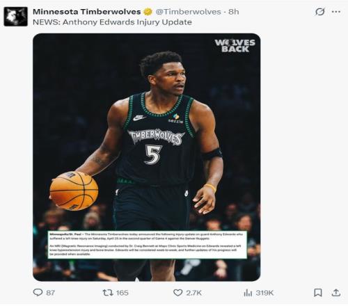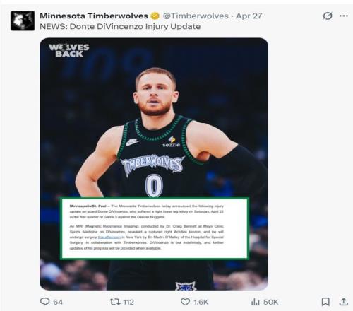 迪溫琴佐確診了跟腱斷裂,等于森林狼此役缺少了兩個先發(fā)球員。