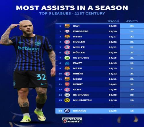 本世紀(jì)單賽季助攻排名:哈維24助居首,本賽季迪馬爾科18助