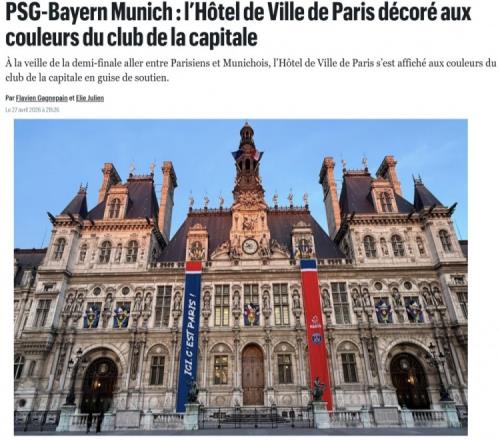 在明天凌晨進(jìn)行的歐冠半決賽首回合,巴黎圣日耳曼將在主場(chǎng)迎戰(zhàn)拜仁。當(dāng)?shù)貢r(shí)間本周一晚,巴黎市政廳外裝飾為巴黎圣日耳曼俱樂部的顏色,并懸掛了巴黎圣日耳曼俱樂部的傳統(tǒng)加油口號(hào)“這里是巴黎”的標(biāo)語。以此表示對(duì)俱樂部的支持。