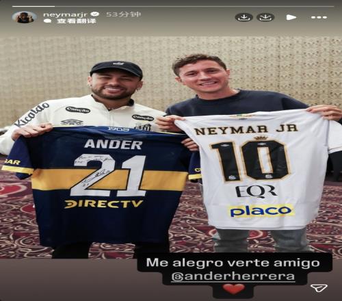 內馬爾與效力于博卡青年的埃雷拉互贈球衣,內馬爾社媒曬出兩人合照,配文:“很高興見到你,朋友?!?/p>