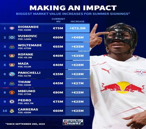 去年夏窗簽約球員身價上漲榜:揚迪奧曼德居首,武什科維奇次席