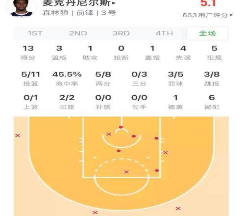 反觀首發(fā)球員,麥丹本場進攻手感一般,11投5中,三分3中0,罰球5中3,僅得13分,雖然數(shù)據(jù)全面,但火力明顯不足,沒能給主力分擔更多壓力。