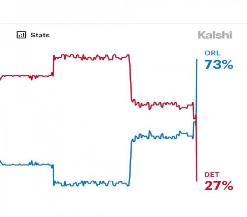 數(shù)據(jù)預(yù)測平臺Kalshi Sports曬出數(shù)據(jù),輸?shù)舯緢霰荣惡蠡钊麜x級次輪的概率已經(jīng)跌倒27%,魔術(shù)高達(dá)73%。