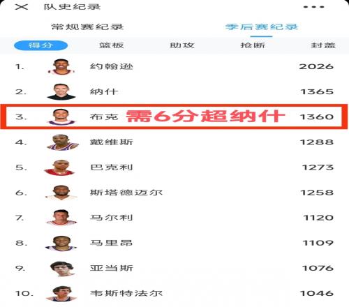 截至發(fā)稿,布克拿到13分,季后賽得分超越納什(1365分)升至隊史第二,僅次于凱文·約翰遜(2026)。
