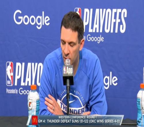 體育播報4月28日宣 NBA季后賽首輪G4,雷霆131-122勝太陽,大比分4-0晉級。賽后雷霆主帥戴格諾特接受了媒體采訪,以下為完整版采訪內(nèi)容。