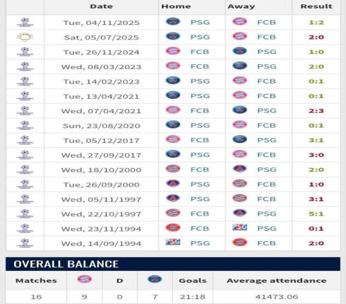 拜仁巴黎歷史交鋒戰(zhàn)績:拜仁9勝7負略占上風(fēng),近6次巴黎僅1勝