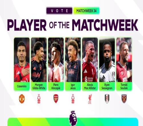 2025-2026賽季英超第34輪,誕生了多場(chǎng)亮眼的個(gè)人發(fā)揮。英超聯(lián)賽官方篩選出七位最佳球員,邀請(qǐng)球迷投票,選出本輪英超最佳球員,其中包括曼聯(lián)中場(chǎng)卡塞米羅、諾丁漢森林隊(duì)長(zhǎng)摩根-吉布斯-懷特、阿森納后衛(wèi)因卡皮耶、森林前鋒伊戈?duì)?熱蘇斯、利物浦中場(chǎng)麥卡利斯特、富勒姆邊后衛(wèi)瑞恩-塞塞尼翁以及西漢姆聯(lián)中場(chǎng)紹切克。