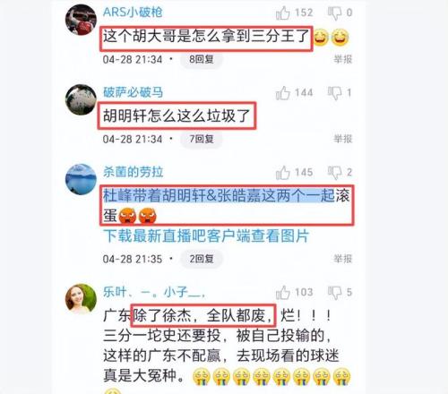 除了外援不中用,國(guó)內(nèi)球員也普遍低迷,發(fā)揮失常。國(guó)內(nèi)球員除了徐杰和杜潤(rùn)旺正常發(fā)揮外,個(gè)個(gè)都沒(méi)有存在感。而表現(xiàn)最令人失望的就是杜鋒兩個(gè)愛(ài)將胡明軒和張皓嘉,這兩人前期的狀態(tài)都不適合打季后賽,可是杜鋒偏要他倆打,把陳家政和焦泊喬排除在比賽名單之外,結(jié)果遭到報(bào)應(yīng),杜鋒這兩名愛(ài)將成為廣東隊(duì)12人中唯二不得分的隊(duì)員。胡明軒打了5投0中,外線都是大空位,卻是4投0中,沒(méi)有一次罰球,也沒(méi)有運(yùn)動(dòng)戰(zhàn)得分,全場(chǎng)吞了0蛋。正負(fù)值也是全隊(duì)最低,在場(chǎng)輸15分。球迷說(shuō),他最近三分大賽冠軍不知是如何得來(lái)的?