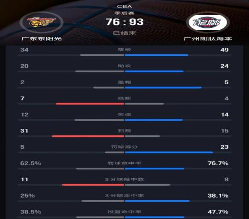 4月28日,CBA季后賽12進(jìn)8比賽首回合,廣東東陽光將坐鎮(zhèn)主場迎戰(zhàn)廣州朗肽海本,最終廣州隊(duì)以93比76戰(zhàn)勝廣東隊(duì),拿下季后賽首回合勝利。