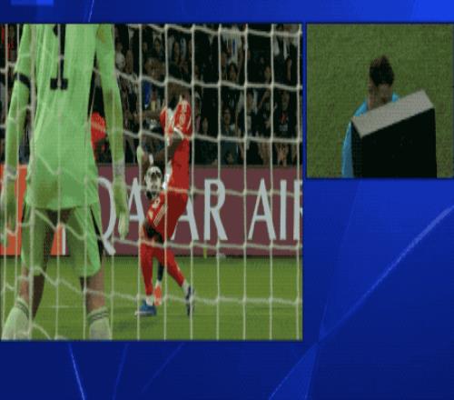 上半場(chǎng)補(bǔ)時(shí)階段,VAR介入,慢鏡頭顯示,登貝萊的傳中打在了阿方索·戴維斯的手臂上,裁判判罰點(diǎn)球。