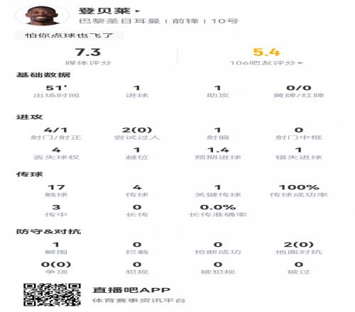登貝萊半場數據:4射1正傳射建功+造點+2失單刀,評分7.3