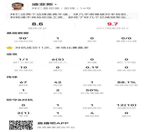 體育播報(bào)4月29日宣 拜仁在本輪歐冠客場(chǎng)4-5不敵巴黎,迪亞斯本場(chǎng)數(shù)據(jù)如下: