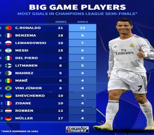 歐冠改制后半決賽進(jìn)球榜:C羅13球居首,本澤馬、萊萬、梅西在列
