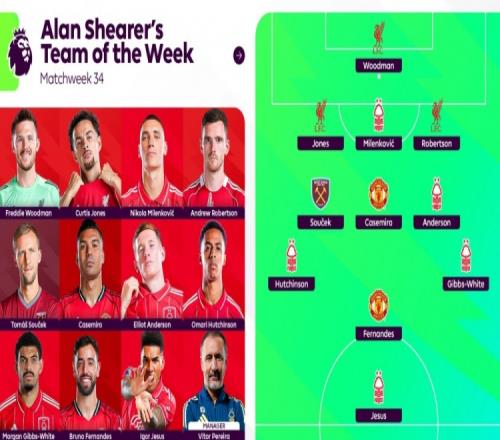 希勒評英超第34輪最佳陣:B費、卡塞米羅在列,諾丁漢森林5人入選